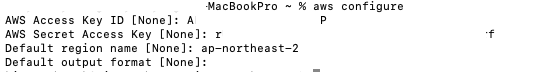 - Default region name: 서울 리전인 ap-northeast-2 를 입력하거나, 기본값으로 설정되어 있다면 엔터를 눌러 넘어간다 (리전은 알맞게 설정한다)