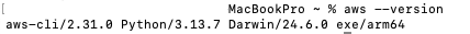 - 설치 완료 후 터미널에서 아래 명령어를 입력하여 AWS CLI 버전 정보를 확인한다