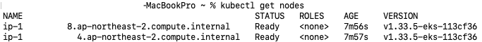 - 이 명령어는 현재 Kubectl이 연결된 클러스터에 속한 워커 노드 목록을 보여준다. Kubernetes의 컨트롤 플레인은 관리형 서비스이므로 일반적으로 직접 조회되지 않는다