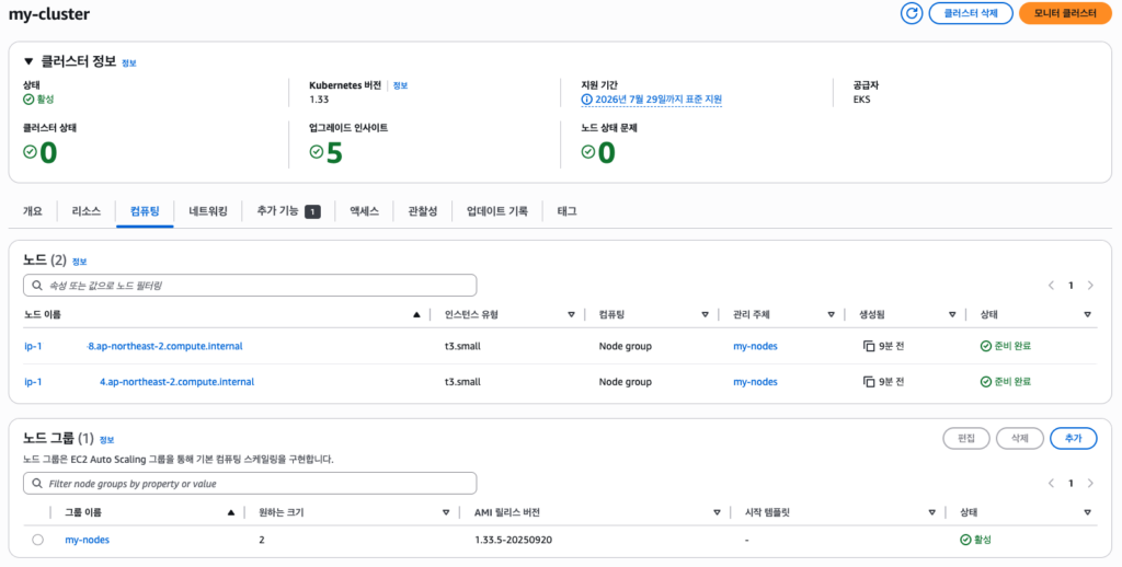 - –region ap-northeast-2: 클러스터가 위치한 AWS 리전을 지정한다 (여기서는 서울 리전)