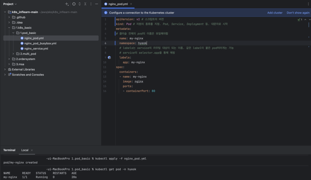 YAML 파일에 있는 디렉터리에서 아래 명령어를 실행하여 Pod를 생성한다. 명령어를 입력하는 위치는 YAML 파일이 있는 위치여야 한다