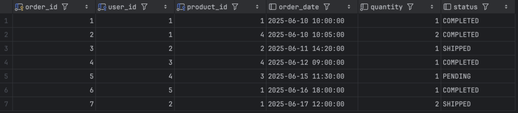 • users, products 테이블은 user_id, product_id 라는 단일 키를 가지고 있으므로, 이 시점에서 이미 2NF를 만족한다. orders 테이블의 기본 키는 order_id이고 user_id와 product_id는 외래 키로 참조되므로, 비기본 키 컬럼인 order_date, quantity, status는 order_id 전체에 종속된다. 따라서 2NF를 만족한다