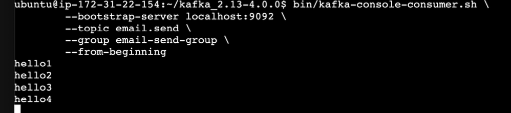 명령어를 실행하면 hello1, hello2, hello3, hello4 메시지가 모두 출력될 것이다. 이는 email-send-group 이라는 컨슈머 그룹이 처음 생성되어 이전에 읽은 기록이 없었기 때문에 –from-beginning 옵션에 따라 모든 메시지를 읽은 것이다