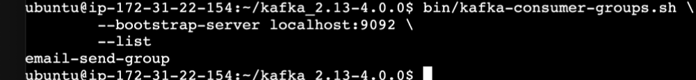 - –group email-send-group: email-send-group 이라는 이름의 컨슈머 그룹을 지정한다. 만약 해당 이름의 컨슈머 그룹이 존재하지 않으면 새로 생성한다.