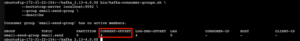 여기서 주목할 부분은 CURRENT-OFFSET 이다. CURRENT-OFFSET이 4로 되어 있다면, 이는 email-send-group 컨슈머 그룹이 오프셋 0, 1, 2, 3번 메시지까지 이미 읽었으며, 다음에 읽어야 할 메시지의 오프셋 번호를 4번임을 의미한다