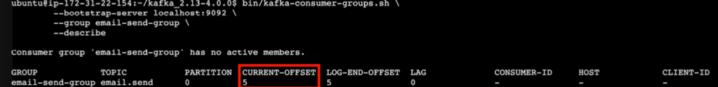 이제 CURRENT-OFFSET이 5로 변경된 것을 확인할 수 있다. 이는 email-send-group이 오프셋 0부터 4까지의 메시지를 모두 읽었으며, 다음에 읽을 메시지의 오프셋이 5임을 의미한다
