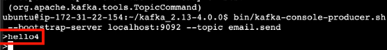 bin/kafka-console-producer.sh --bootstrap-server localhost:9092 --topic email.send > hello5 Ctrl+C