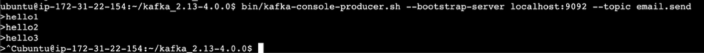 메시지를 입력하고 엔터를 누르면 해당 메시지가 email.send 토픽으로 전송된다. 입력이 끝나면 Ctrl+C를 눌러 프로듀서 세션을 종료한다